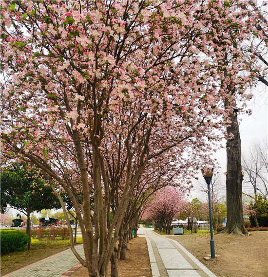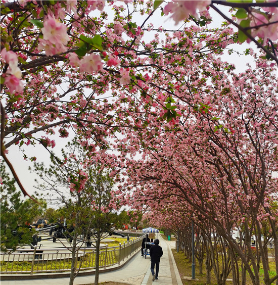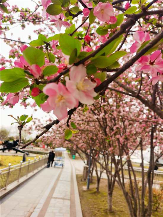 日前,周口公園里的海棠紛紛綻放。在公園內(nèi)的道路上,海棠已進入盛花期,粉色的花朵如夢似幻,令人沉醉。