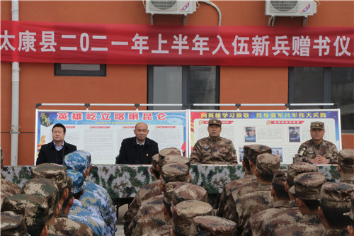 為打牢新兵聽(tīng)黨指揮、獻(xiàn)身強(qiáng)軍事業(yè)的思想政治根基,3月19日上午,太康縣2021年上半年入伍新兵贈(zèng)書(shū)儀式在縣民兵訓(xùn)練基地舉行。太康縣委常委、人武部部長(zhǎng)于永前,縣黨史辦主任黃光遠(yuǎn)、縣退役軍人事務(wù)局黨組書(shū)記、局長(zhǎng)潘布道及即將入伍的190名新兵等參加儀式。會(huì)議由縣人武部副部長(zhǎng)張大釗主持。