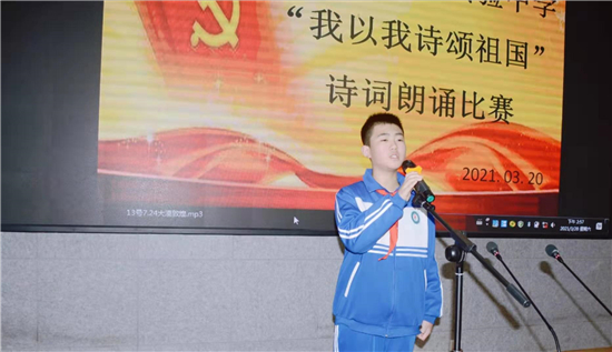 “我是你掛著眼淚的笑渦/我是新刷出的雪白的起跑線/是緋紅的黎明/正在噴薄/——祖國?。 币痪渚滹柡钋榈睦收b,一陣陣熱情如潮的掌聲。3月20日下午,鄲城縣第二實驗中學(xué)“我以我詩頌祖國”學(xué)生愛國詩詞朗誦比賽熱烈舉行。