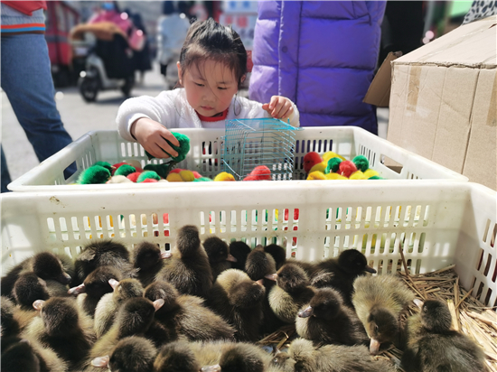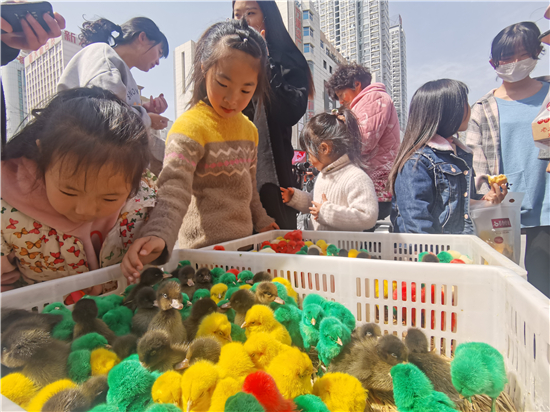 3月21日,在城區(qū)五一路口,幾個(gè)售賣小雞小鴨的攤位前吸引了不少市民。所售賣的小雞小鴨被染上了紅色、黃色、綠色等色彩艷麗的顏色,憨態(tài)可掬的小雞小鴨尤其受到了孩子們的喜愛,不時(shí)有過往行人駐足詢問價(jià)格。