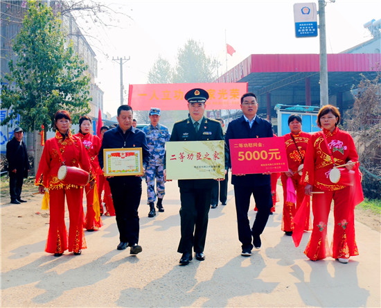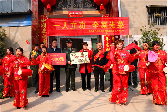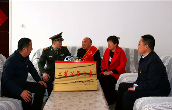 李峰說:“一張立功喜報(bào),不僅是軍人榮譽(yù)的象征、成長進(jìn)步的見證,也承載著軍人家屬的期盼與慰藉。功臣是實(shí)現(xiàn)強(qiáng)軍興軍目標(biāo)的尖兵,他們?cè)诓筷?duì)建功立業(yè),我們力所能及服務(wù)保障好他們的家人,積極在全社會(huì)營造起‘功臣受愛戴、軍人受尊崇、軍屬受尊敬’的氛圍?!睘榇?,鹿邑縣人武部積極構(gòu)建軍人軍屬榮譽(yù)體系,每逢重大節(jié)日,都要協(xié)調(diào)地方黨委、政府開展為現(xiàn)役軍人和軍屬送喜報(bào),掛功臣匾、光榮牌等活動(dòng),通過活動(dòng)激勵(lì)等形式,讓軍人軍屬享有更多的“專屬榮光”,努力營造“一人參軍,全家光榮;一人立功,全村光榮”的濃厚氛圍,更加堅(jiān)定了軍屬支持子女獻(xiàn)身國防的決心,進(jìn)一步激發(fā)了鹿邑籍官兵獻(xiàn)身軍營、報(bào)效祖國的積極性。②9