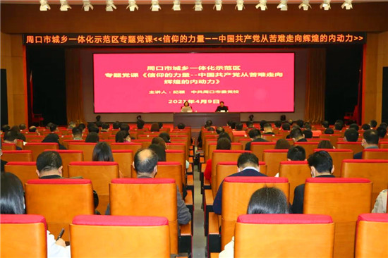 為貫徹落實習(xí)近平總書記黨史學(xué)習(xí)教育動員大會重要講話精神,全面推進全區(qū)黨史學(xué)習(xí)教育工作,4月9日上午,周口市城鄉(xiāng)一體化示范區(qū)組織專題黨課學(xué)習(xí),邀請中共周口市委黨校黨史黨建教研室主任,副教授紀(jì)穎講授《信仰的力量——中國共產(chǎn)黨從苦難走向輝煌的內(nèi)動力》專題黨課,示范區(qū)副處級以上干部、區(qū)直全體黨員干部、鄉(xiāng)、辦、站、所負(fù)責(zé)人、全體村(社區(qū))支部書記參加會議。