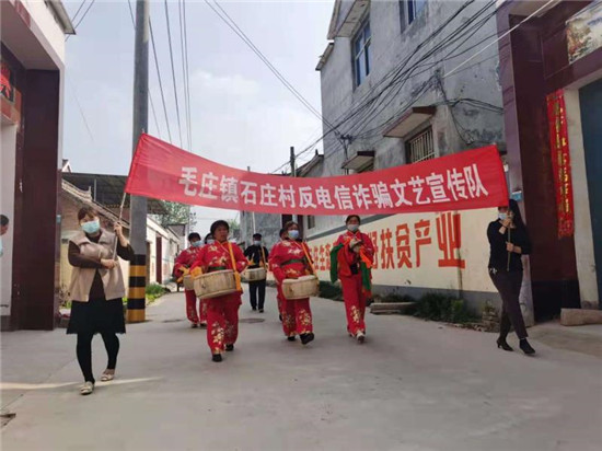 “父老鄉(xiāng)親聽我說,現(xiàn)在騙子真是多。莫占便宜要牢記,發(fā)家致富靠自己……”毛莊鎮(zhèn)石莊村這樣一支反電詐文藝宣傳隊瞬間吸引了人們的眼球?!艾F(xiàn)在我村的年輕人大部分都出去掙錢去了,在家的大部分是老人,我們幾個一合計把宣傳單上的內(nèi)容編成順口溜,這樣更好懂、更好記!”石莊村文藝宣傳隊的張秀芬笑著說。