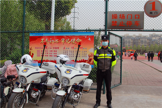 活動計劃是上午9時開始,朱衛(wèi)兵帶領(lǐng)鐵騎隊從早上7點就來到校園周邊布置崗哨,對鄲城一高周邊的校園路、公園東路、一高北路、一高東路、公園北路進(jìn)行車輛引導(dǎo),共出動警力46人,警車一部,警用摩托車21輛,形成了各路口有崗、50米一哨。一方面確保車輛有序停放,另一方面守護(hù)師生和家長安全。