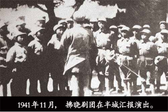 1938年深秋,劇團(tuán)到泌陽(yáng)縣鄧莊鋪演出,群眾自動(dòng)地找木棍、找門(mén)板、挖土埋柱子,很快搭起一座戲臺(tái),掛上幕布,點(diǎn)燃油燈,男女老少坐在戲臺(tái)前的空地上。戲臺(tái)上先是演員們合唱抗日歌曲《新四軍軍歌》《游擊隊(duì)歌》《到敵人后方去》等,后演出話劇《突擊》。當(dāng)劇中的老爺爺抱著被日寇殺死的孩子,含淚控訴敵人的暴行時(shí),臺(tái)下的觀眾禁不住地憤怒高呼:“打倒日本帝國(guó)主義!把日本鬼子趕出中國(guó)!”1939年11月初,徐海東隨劉少奇由竹溝到華中路過(guò)新興集,彭雪楓命拂曉劇團(tuán)組織一個(gè)晚會(huì),以示熱烈歡迎。拂曉劇團(tuán)接受任務(wù)后,大家爭(zhēng)分奪秒,只用了一天時(shí)間,就集體創(chuàng)作排練出京劇《徐海東粉碎日寇“掃蕩”》,第二天就在歡迎晚會(huì)上演出。