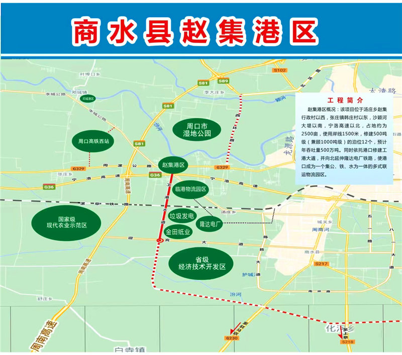 2017年,商水縣政府按照前瞻30年、謀劃15年、做實(shí)近5年工作要求,開(kāi)始規(guī)劃修建位于湯莊鄉(xiāng)趙集行政村以西,張莊鎮(zhèn)韓莊村以東,沙潁河大堤以南,寧洛高速以北的趙集作業(yè)區(qū)。規(guī)劃建設(shè)占地約720畝、總投資6.37億元的趙集港項(xiàng)目,同時(shí)修建12個(gè)1000噸級(jí)泊位,其中散貨泊位8個(gè),通用泊位2個(gè),多用途泊位2個(gè),占用岸線1250米,預(yù)計(jì)年吞吐量達(dá)475萬(wàn)噸。碼頭采用順岸式布置,結(jié)構(gòu)采用重力式扶壁結(jié)構(gòu),前沿配置30噸門(mén)座式固定吊裝卸作業(yè)。港口涵蓋貨物拆解區(qū)、散件堆放區(qū)等4個(gè)功能區(qū),集裝箱露天堆場(chǎng)、大型貨車(chē)停車(chē)場(chǎng)等5個(gè)場(chǎng)地。圍繞趙集港,高標(biāo)準(zhǔn)規(guī)劃建設(shè)占地約6.2平方公里的多式聯(lián)運(yùn)臨港經(jīng)濟(jì)園區(qū),下設(shè)金田紙業(yè)、建材倉(cāng)儲(chǔ)兩個(gè)物流園區(qū),涵蓋建材及建材制品園區(qū)、造紙業(yè)原料及成品園區(qū)、紡織服裝原料及成品園區(qū)3個(gè)功能園區(qū)。該項(xiàng)目建成投入使用后,不但能加快商水縣紡織園區(qū)、循環(huán)園區(qū)、經(jīng)濟(jì)開(kāi)發(fā)區(qū)、隆達(dá)電廠等企業(yè)物質(zhì)的流轉(zhuǎn),而且能使商水港成為周口沙潁河重要的鐵運(yùn)、陸運(yùn)、水運(yùn)交通樞紐、貨物貿(mào)易和物流中轉(zhuǎn)聚集區(qū),從而進(jìn)一步促進(jìn)商水經(jīng)濟(jì)的健康、快速發(fā)展。