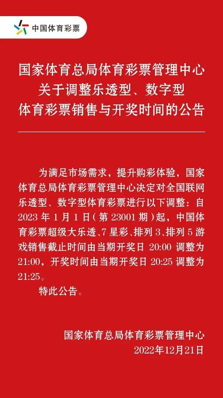 1月1日(第23001期)起,大樂透、7星彩、排列3、排列5游戲銷售截止時(shí)間由當(dāng)期開獎(jiǎng)日20:00調(diào)整為21:00,開獎(jiǎng)時(shí)間由當(dāng)期開獎(jiǎng)日20:25調(diào)整為21:25。購(gòu)彩者可通過電視、廣播、網(wǎng)站、手機(jī)客戶端、報(bào)紙等渠道查閱開獎(jiǎng)信息。