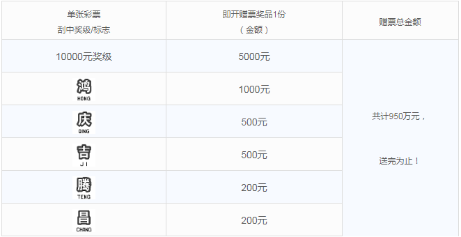 活動(dòng)期間,購彩者在我省任一體彩銷售實(shí)體店購買指定活動(dòng)票種,若單張彩票刮中符合獎(jiǎng)勵(lì)條件的獎(jiǎng)級(jí)或標(biāo)志,經(jīng)實(shí)體店終端兌獎(jiǎng)設(shè)備成功完成獎(jiǎng)金兌付(如中獎(jiǎng))及促銷兌獎(jiǎng)掃描后,即可獲得即開票贈(zèng)票獎(jiǎng)品一份。總額有限,送完為止,詳見下表: