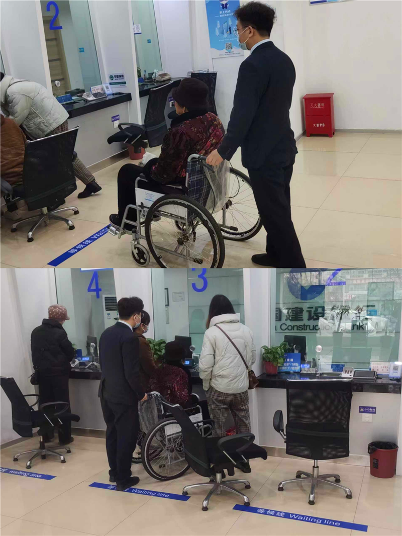 3月27日上午11點左右,項城蓮花大道支行大堂經理張云磊在門口引導客戶時,發(fā)現(xiàn)兩位客戶扶著另一位客戶走進網點。注意到客戶雙腿行走不便,他立即推來輪椅,把客戶扶到輪椅上。三位客戶不熟悉銀行辦業(yè)務流程,大堂經理張云磊全程跟隨指導辦理業(yè)務。經詢問,大堂經理得知客戶前來辦理社保卡激活業(yè)務,以便領取殘疾人補貼。大堂經理立即幫他安排綠色通道,幫助家屬推輪椅到柜臺辦理,在一旁指導客戶填單跟簽名。