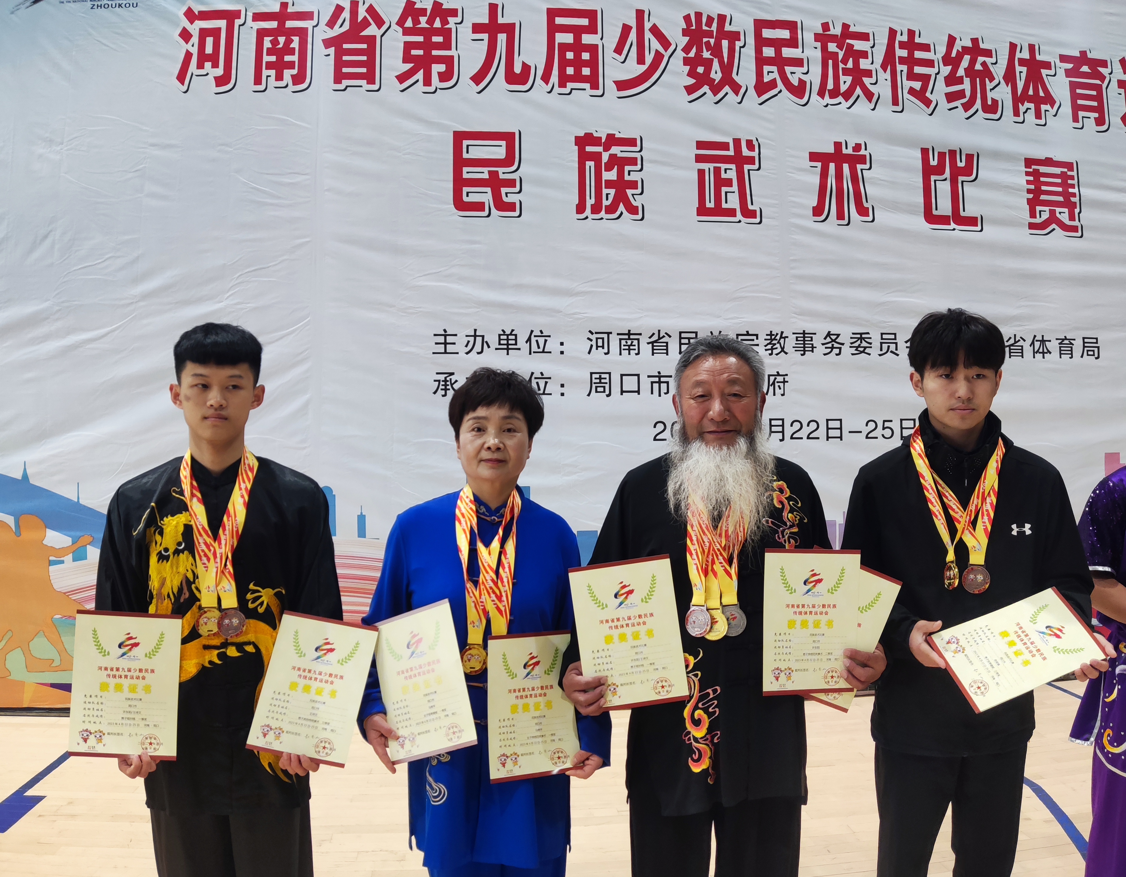 周口隊(duì)運(yùn)動(dòng)員王詩文、馬艷平、許東陽、蘇俊瑞領(lǐng)取獎(jiǎng)牌和證書(從左至右)。
