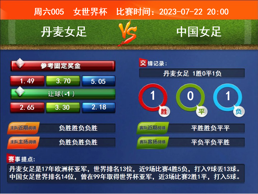 比賽時(shí)間:2023-07-22 20:00賽事提點(diǎn):丹麥女足是17年歐洲杯亞軍,世界排名13位,近9場比賽4勝5負(fù),打入9球丟13球。中國女足世界排名14位,曾在99年取得世界杯亞軍,近3場比賽2勝1平,打入5球。