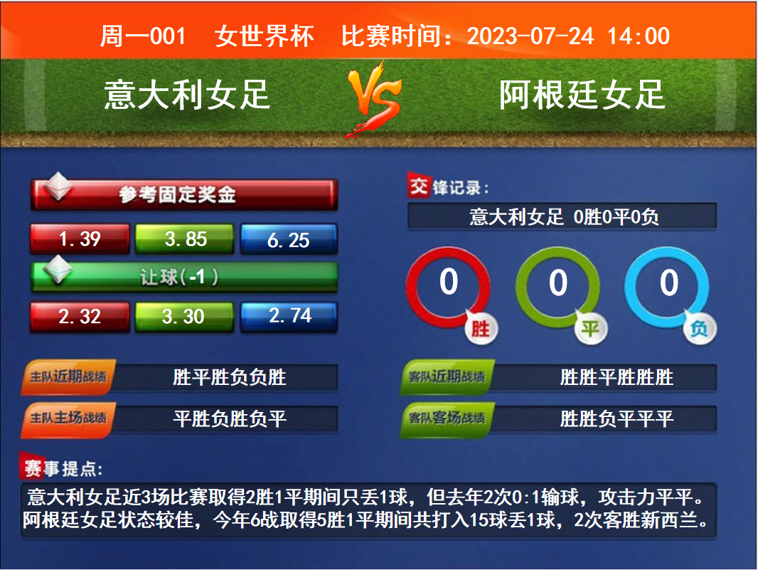 周一001 女世界杯 意大利女足VS阿根廷女足