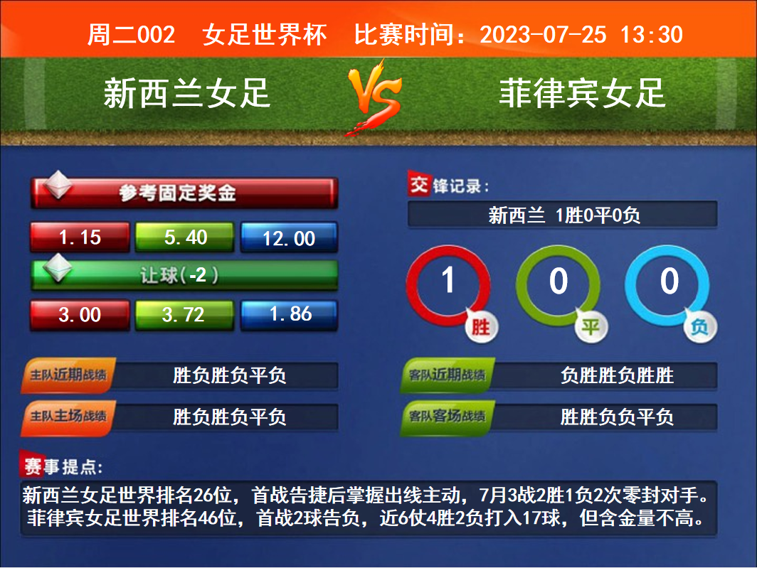 比賽時間:2023-07-25 13:30賽事提點:新西蘭女足世界排名26位,首戰(zhàn)告捷后掌握出線主動,7月3戰(zhàn)2勝1負2次零封對手。菲律賓女足世界排名46位,首戰(zhàn)2球告負,近6仗4勝2負打入17球,但含金量不高。