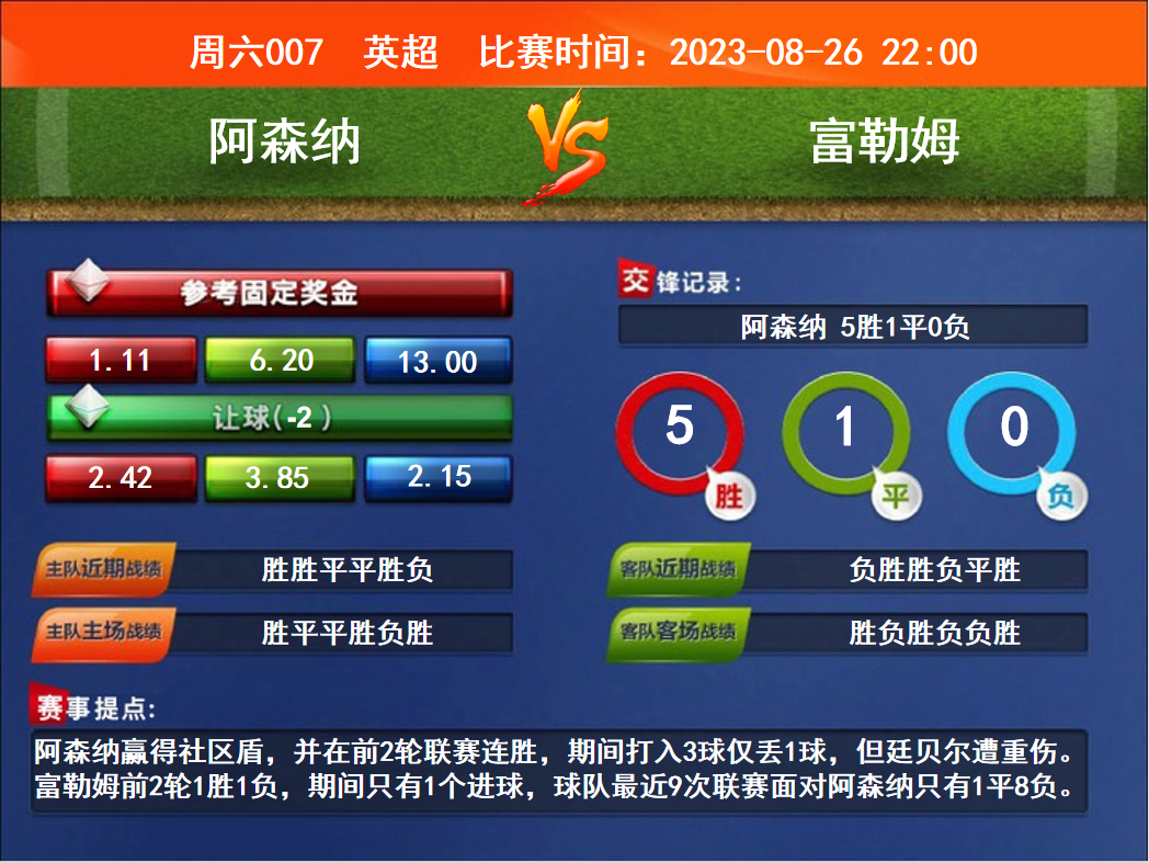 比賽時間:2023-08-26 22:00賽事提點:阿森納贏得社區(qū)盾,并在前2輪聯(lián)賽連勝,期間打入3球僅丟1球,但廷貝爾遭重傷。富勒姆前2輪1勝1負,期間只有1個進球,球隊最近9次聯(lián)賽面對阿森納只有1平8負。