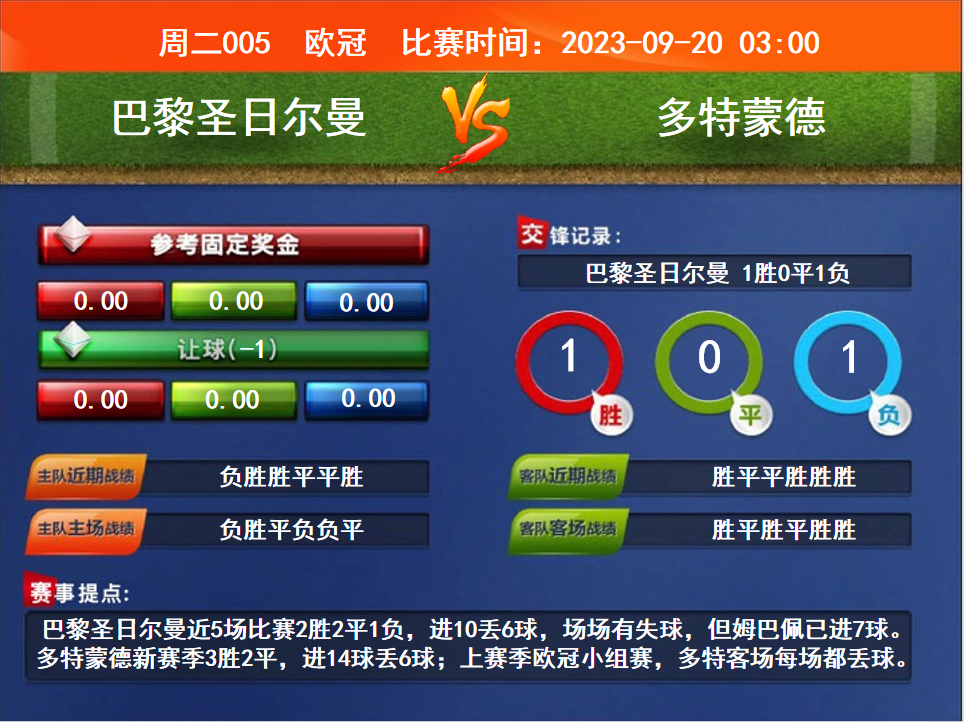 比賽時間:2023-09-20 03:00賽事提點:巴黎圣日爾曼近5場比賽2勝2平1負(fù),進(jìn)10丟6球,場場有失球,但姆巴佩已進(jìn)7球。多特蒙德新賽季3勝2平,進(jìn)14球丟6球;上賽季歐冠小組賽,多特客場每場都丟球。