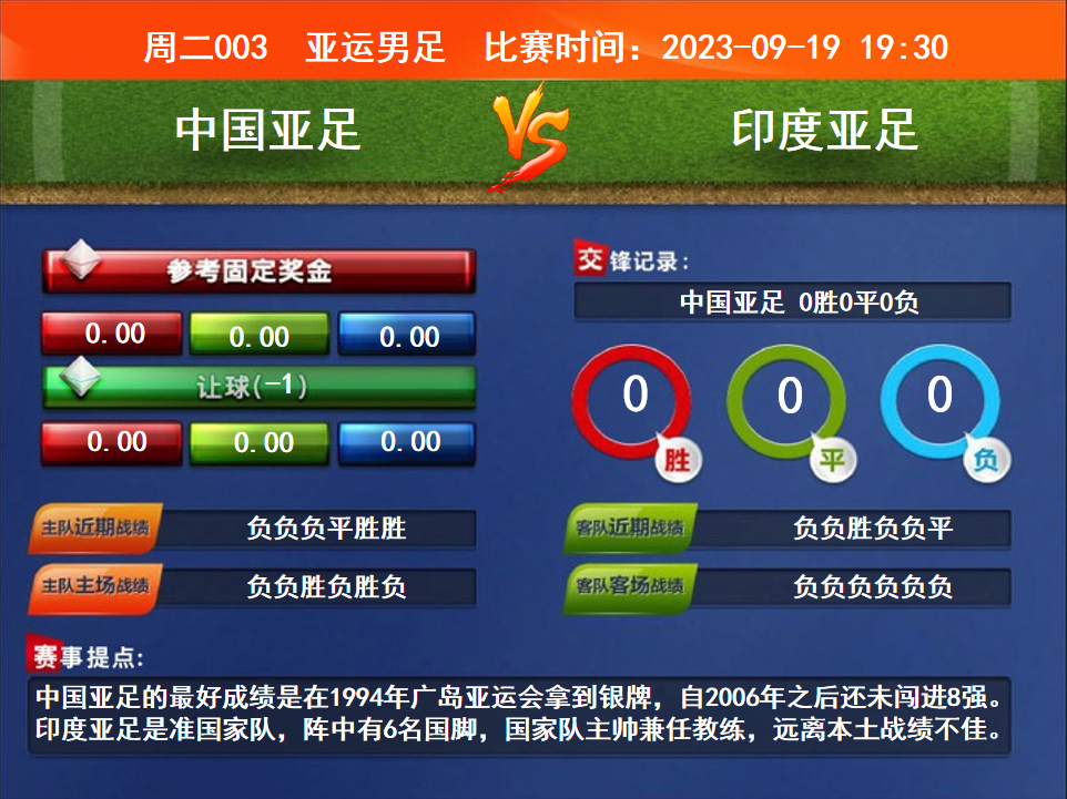 比賽時間:2023-09-19 19:30賽事提點:中國亞足的最好成績是在1994年廣島亞運(yùn)會拿到銀牌,自2006年之后還未闖進(jìn)8強(qiáng)。印度亞足是準(zhǔn)國家隊,陣中有6名國腳,國家隊主帥兼任教練,遠(yuǎn)離本土戰(zhàn)績不佳。