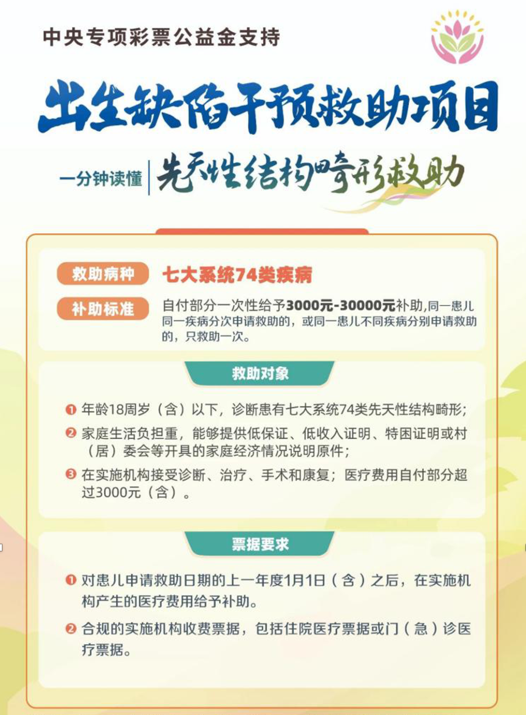 中央專項彩票公益金支持出生缺陷救助項目,旨在向患有遺傳代謝病、先天性結構畸形和功能性出生缺陷等三類出生缺陷疾病的經(jīng)濟困難家庭提供醫(yī)療費用補助,減輕患兒家庭醫(yī)療負擔。該項目由衛(wèi)生健康委委托中國出生缺陷干預救助基金會組織實施。