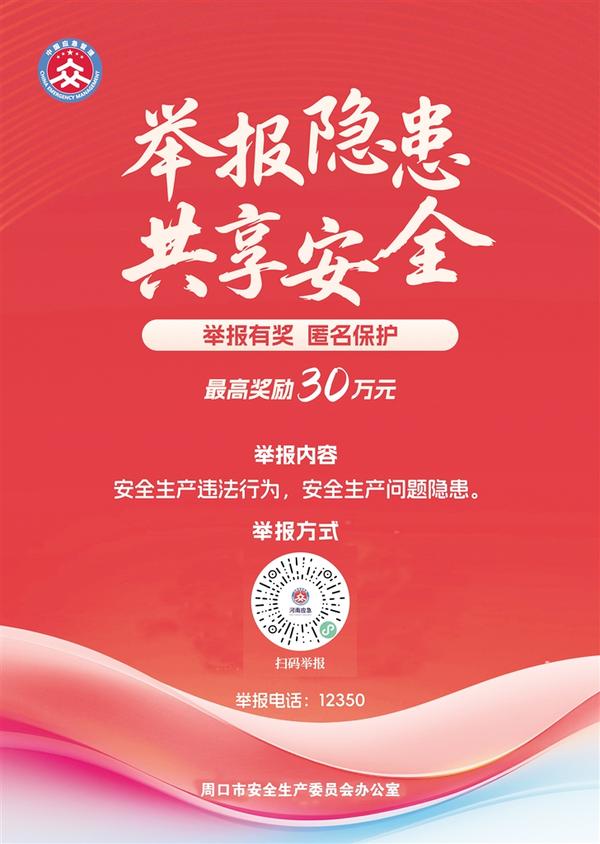周口市安全生產(chǎn)委員會(huì)辦公室以舉報(bào)電話、掃碼舉報(bào)等方式,受理群眾舉報(bào)安全生產(chǎn)非法違法行為線索。一經(jīng)查實(shí),我們將依據(jù)《河南省安全生產(chǎn)領(lǐng)域舉報(bào)獎(jiǎng)勵(lì)實(shí)施辦法》相關(guān)規(guī)定,對(duì)舉報(bào)人予以獎(jiǎng)勵(lì),最高獎(jiǎng)勵(lì)金額30萬元。我們將對(duì)舉報(bào)人個(gè)人信息進(jìn)行嚴(yán)格保密,依法保護(hù)舉報(bào)人的合法權(quán)益。