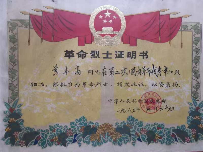 黃德耀的小爺爺黃成香于1935年3月在哥哥黃本富犧牲后的第2個(gè)月參加紅軍。1940年,黃成香在安徽省定遠(yuǎn)縣對(duì)日軍戰(zhàn)斗中英勇?tīng)奚菬o(wú)存,年僅17歲。