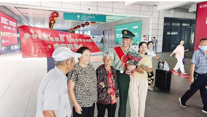 9月4日,在高鐵周口東站出站口,市民們早早守候,手拉橫幅,眼里閃著期待的淚光,迎接從部隊退役的親人。橫幅上的每一個字,都是家人最深沉的愛與最由衷的敬佩:“昔日從戎報國志,今朝卸甲創(chuàng)輝煌?!?/p>