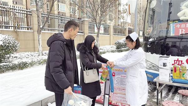 1月19日,熱心市民冒雪步行到獻血車無償獻血,以熱血守護生命。圖為市民獻血后領(lǐng)取無償獻血紀念品。