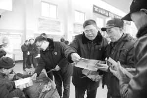 3月6日,“關(guān)愛(ài)農(nóng)民工法治宣傳周”集中宣傳活動(dòng)在周口客運(yùn)中心站門(mén)前舉行,相關(guān)單位設(shè)立咨詢(xún)服務(wù)臺(tái),發(fā)放宣傳資料,回答群眾咨詢(xún)。記者 王映 攝