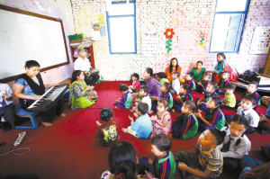 尼泊爾學校復課 5月31日,在尼泊爾的巴克塔普爾,復課的學生們接受音樂治療。據尼泊爾當地媒體報道,尼泊爾教育部已經宣布,全國14個地震受災縣的學校將于5月31日復課。新華社發(fā)