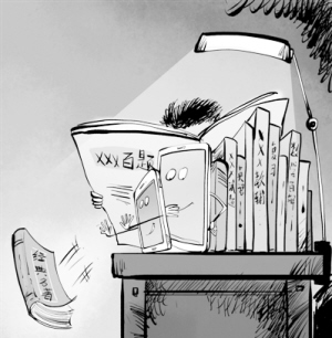 記者調(diào)查發(fā)現(xiàn),在繁重的課業(yè)負擔下,不少初高中學生所讀書籍越來越單一,教輔書占了絕大比例。智能手機的普及,各類社交平臺的出現(xiàn),更是讓學生沉溺于淺閱讀。相反,拿起名著、對話經(jīng)典等深層次閱讀的情況,卻不容樂觀。這正是: