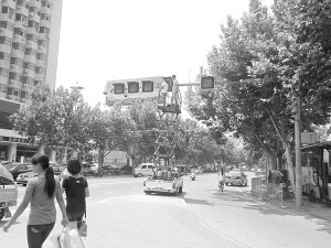 8月14日,周口市區(qū)七一路與中州大道交叉口的一處紅綠燈發(fā)生故障,工人冒著高溫酷暑及時(shí)進(jìn)行搶修,確保交通安全。晚報(bào)記者 張洪濤 攝
